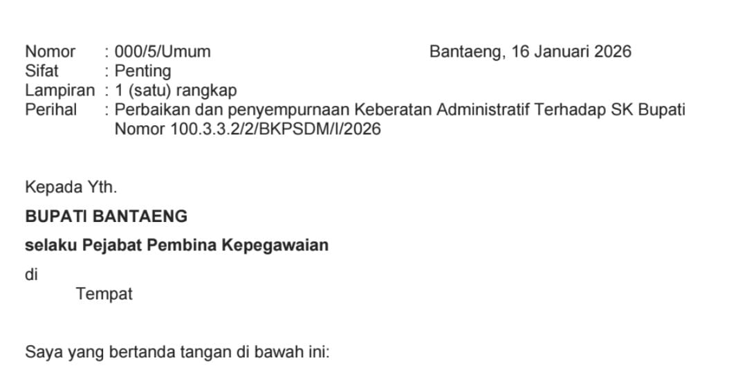 Surat keberatan administratif tersebut bertanggal 16 Januarii 2026 dan ditujukan sebagai respons atas Surat Keputusan (SK) Bupati Bantaeng Nomor 100.3.3.2./2/BKPSDM/2026 tanggal 9 Januari 2026 tentang pengangkatan dan pemberhentian dalam Jabatan Pimpinan Tinggi Pratama di lingkup Pemkab Bantaeng.