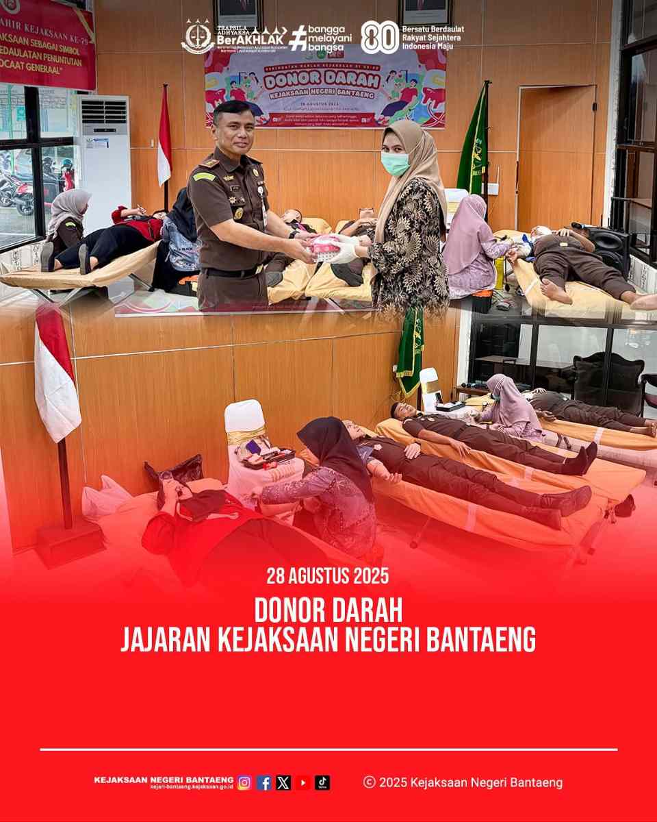 “Melalui kegiatan donor darah ini, kami di Kejaksaan Negeri Bantaeng ingin menegaskan bahwa semangat Kejaksaan bukan hanya dalam penegakan hukum, tetapi juga dalam pengabdian kepada masyarakat,” ungkap Kajari Bantaeng.