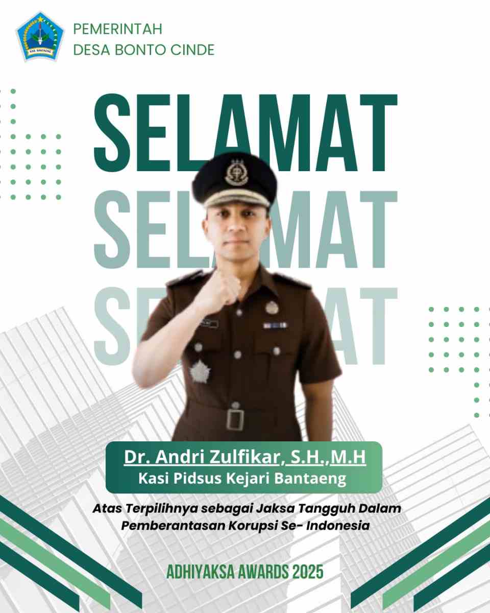 Beritasulsel.com – Kepala Desa Bonto Cinde di Kecamatan Bissappu beserta seluruh jajaran dan segenap lapisan masyarakat, dengan penuh rasa bangga dan hormat, mengucapkan: “Selamat dan sukses kepada Bapak DR. Andri Zulfikar, S.H., M.H (Kepala Seksi Tindak Pidana Khusus) Kejaksaan Negeri Bantaeng), atas terpilihnya sebagai Jaksa terbaik se-Indonesia untuk nominasi Jaksa Tangguh dalam Pemberantasan Korupsi di tingkat nasional di Adhyaksa Awardsn2925.