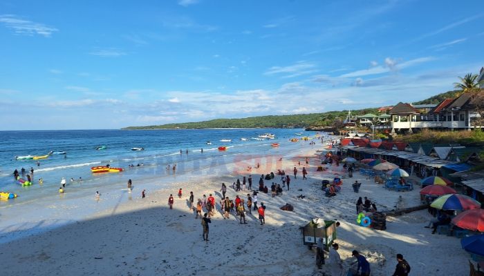 Payung-payung warna-warni berjajar di tepi pantai, sementara pelaku usaha lokal tampak bersiap melayani lonjakan pengunjung yang diperkirakan akan terus meningkat hingga siang hari.