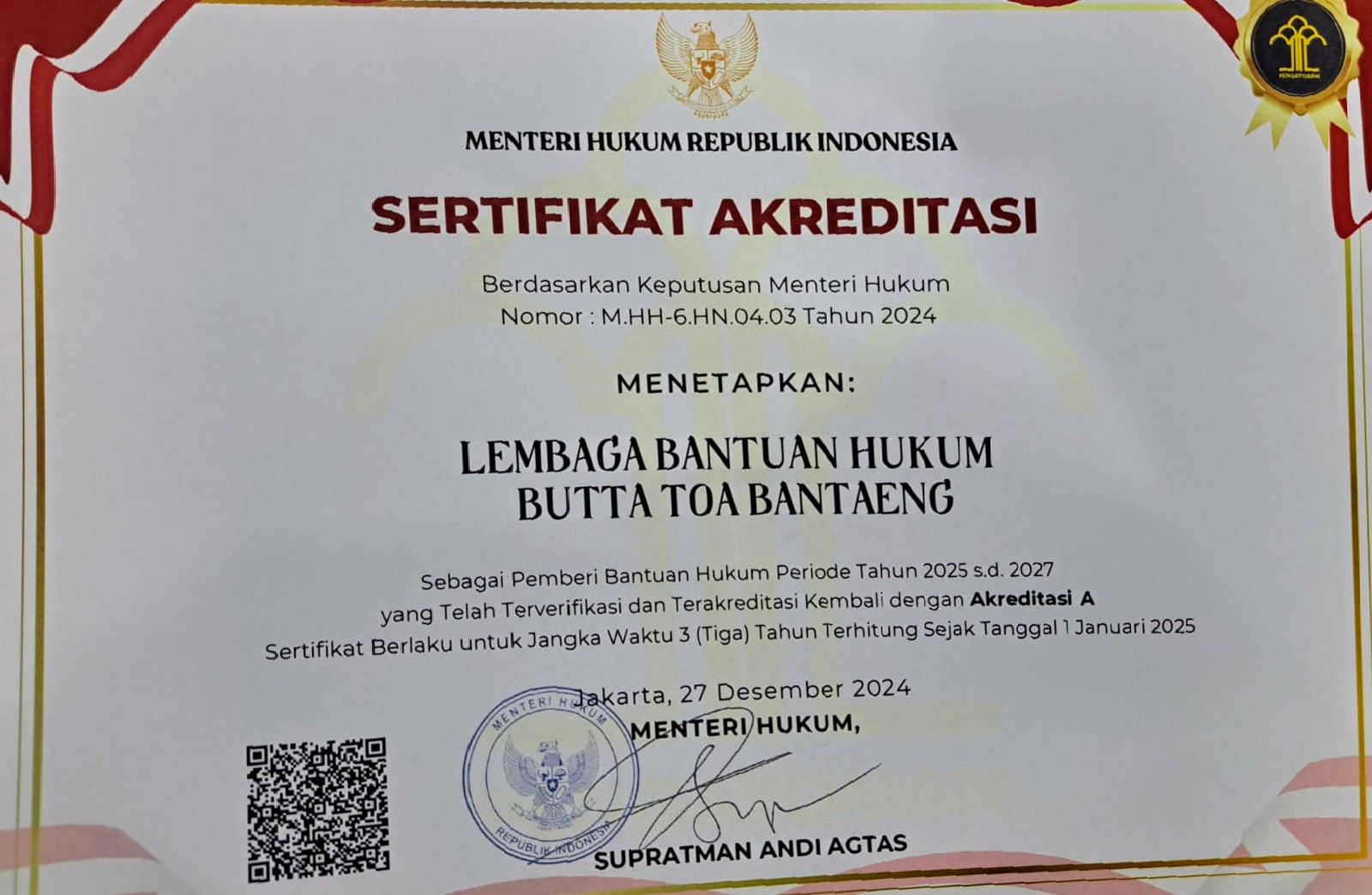 Terbaik di Sulawesi Selatan, LBH Butta Toa Bantaeng Raih Akreditasi ‘A’ Dari Kemenkum RI